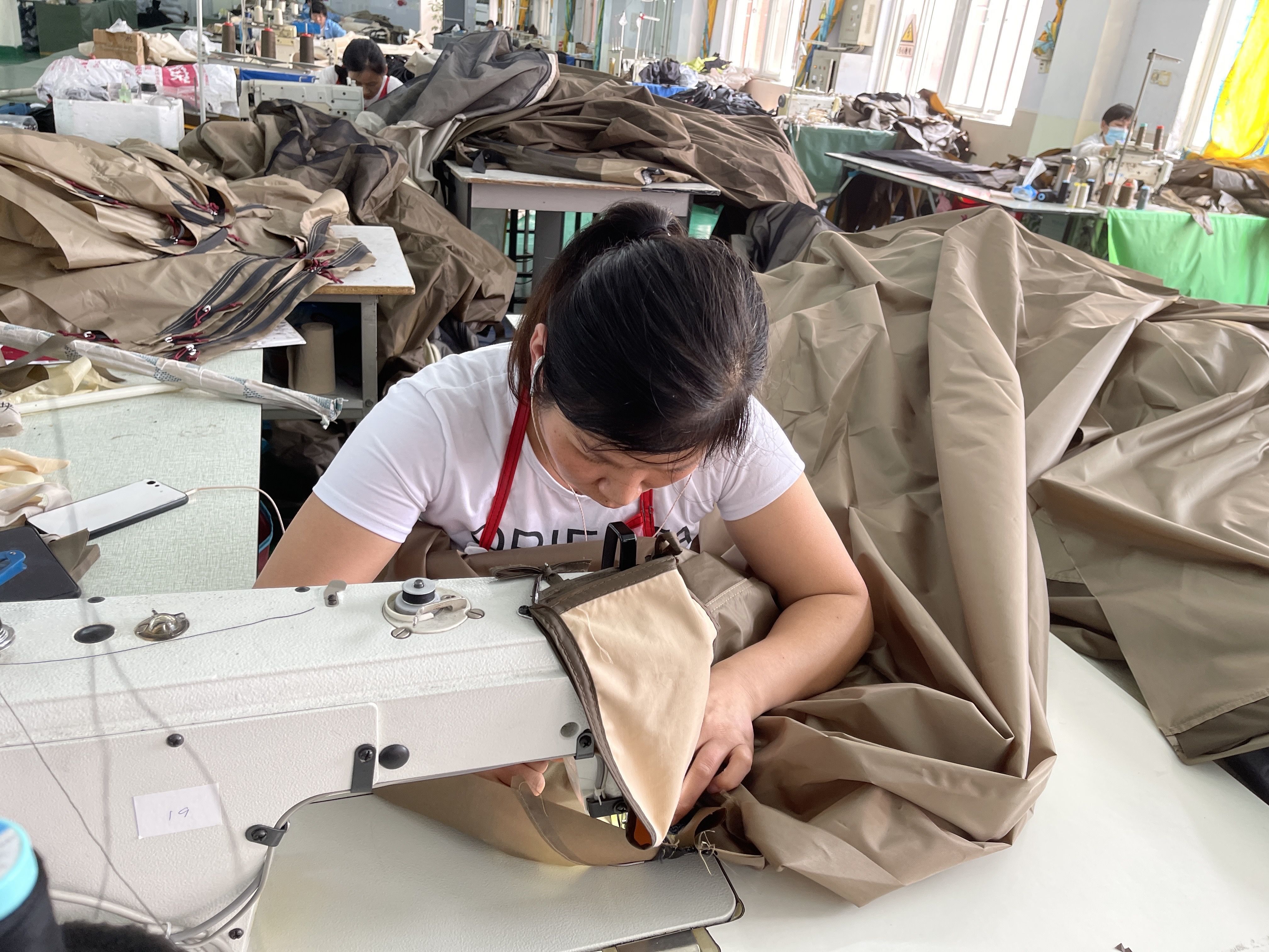 贝来公司的生产车间里,一名女工坐在电子缝纫机前,正将手中的防雨布料仔细地对齐、缝织,另一名女工同样正忙着在布料四边打上拉链,她们的动作熟练而精准。