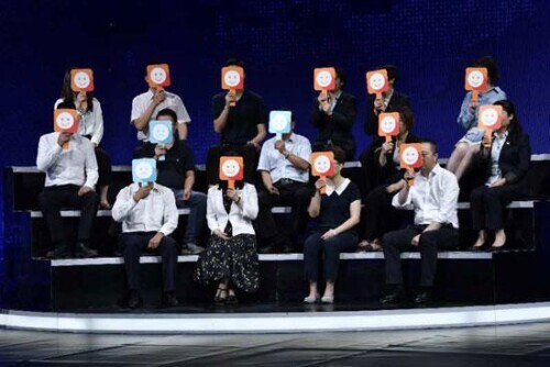 《问政山东》节目现场,由山东省人大代表、省政协委员和群众代表组成的问政代表团集体举牌,对菏泽市市长陈平的回答表达意见,红色笑脸标志表示满意,蓝色哭脸标志表示不满意。图片由《问政山东》节目组提供