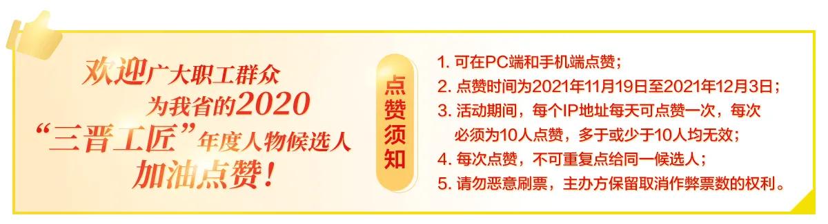 由山西省总工会,山西日报社和山西广播电视台联合举办的2020《三晋工匠》年度人物评选发布活动,经专家评审委员会评审,30名三晋工匠人物候选人已经产生。